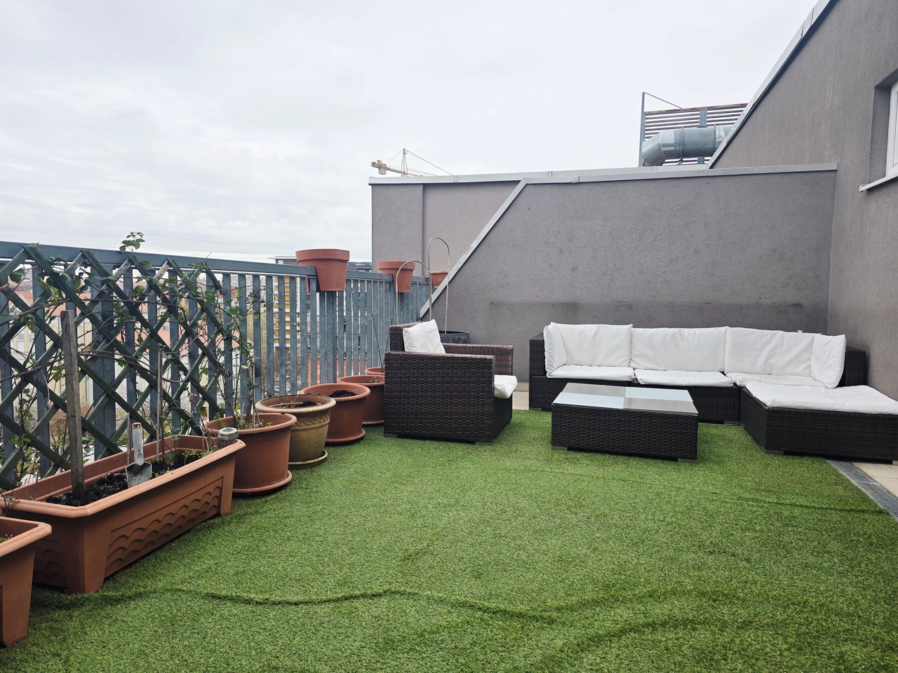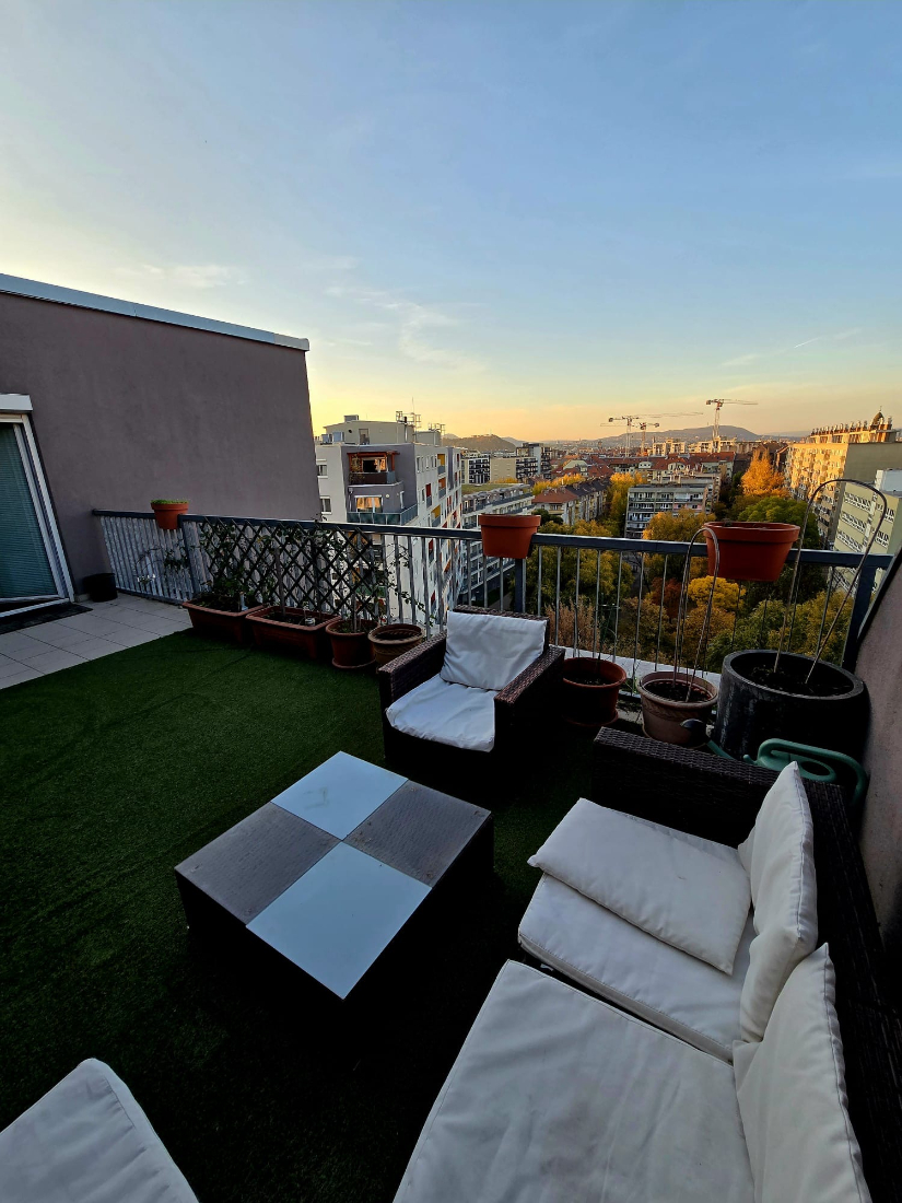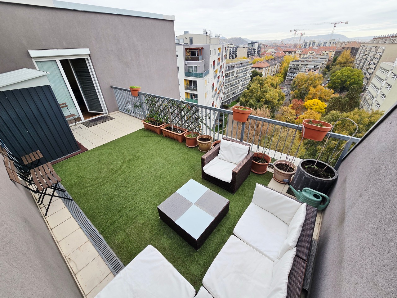 In a newly built residential complex, a bright and modern 42 m² penthouse apartment is available for mid-term rent. The flat features an open-plan living room with an American-style kitchen, a bedroom, a bathroom, plus a 22 m² rooftop terrace and a 3 m² balcony. Fully furnished and equipped with air conditioning and modern appliances.