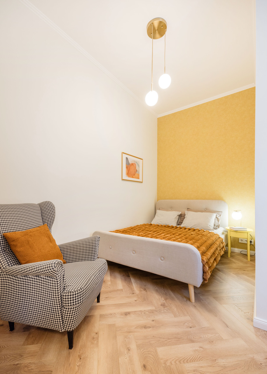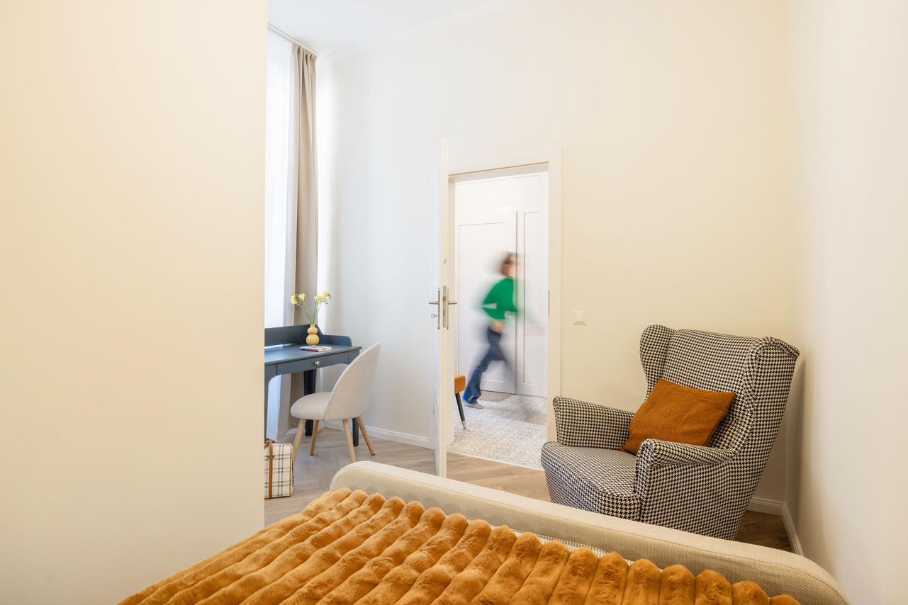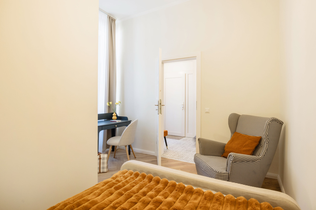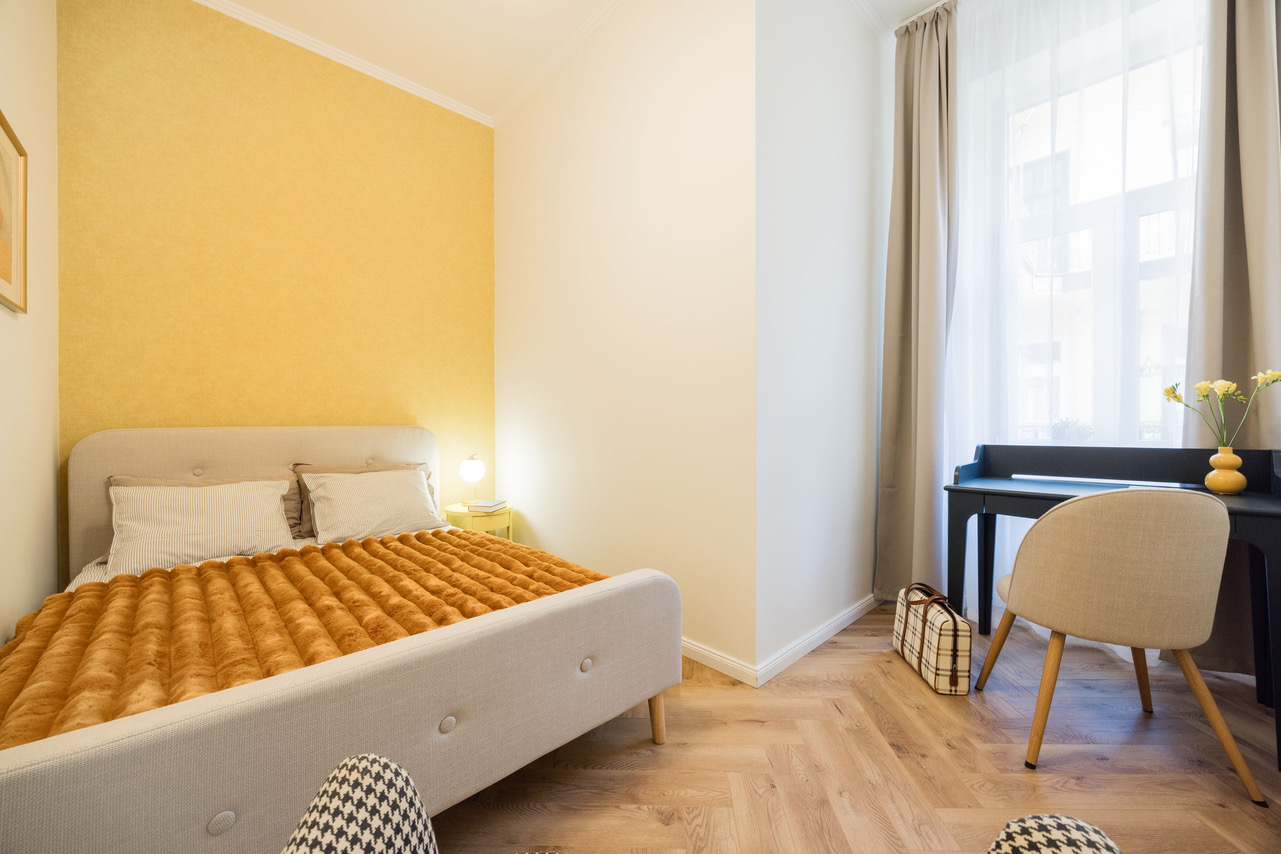 The apartment is bright and airy, suitable for a home office or just a pleasant place to stay in.