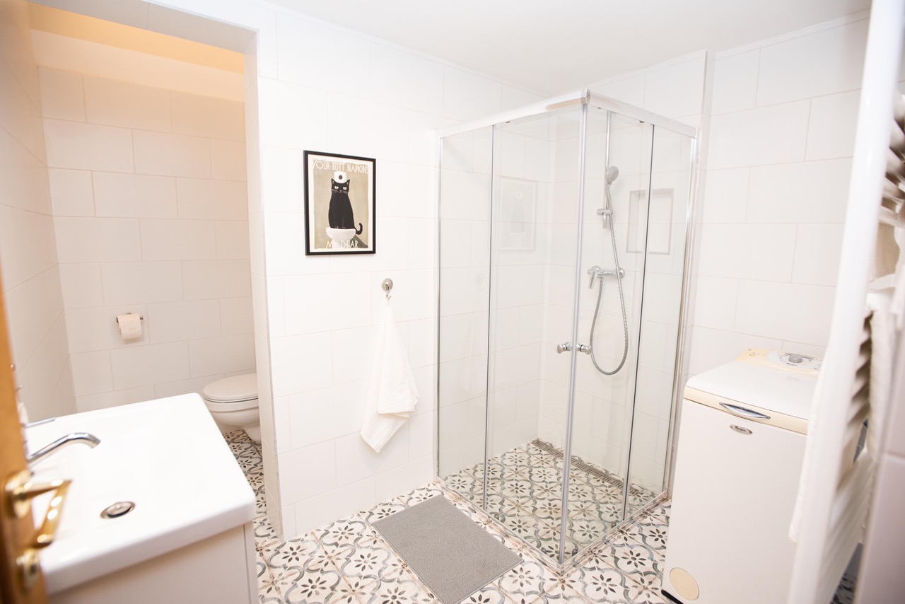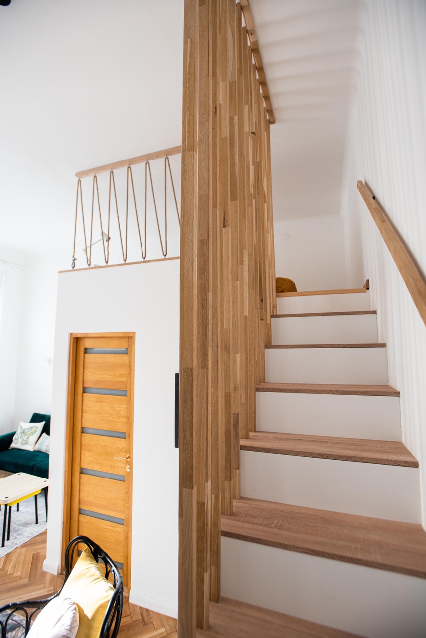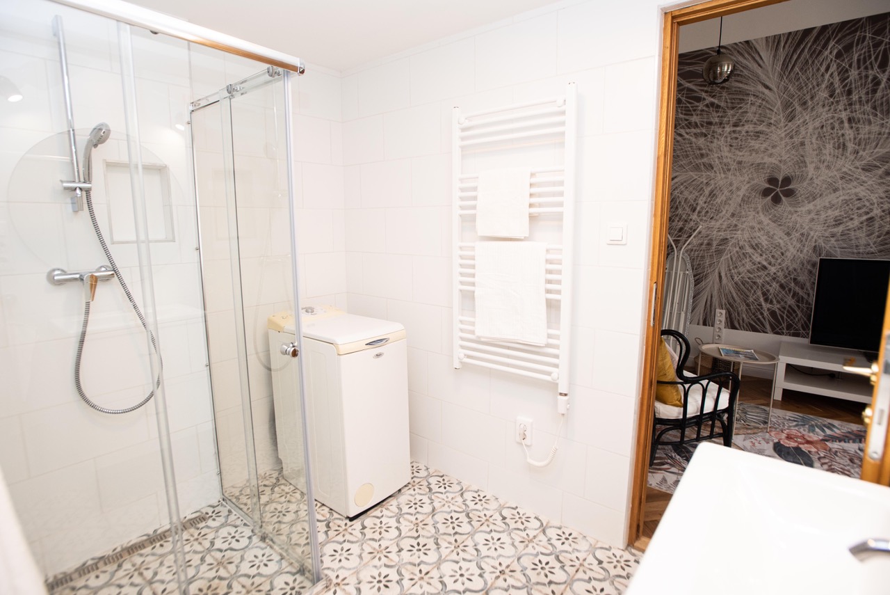 We enter the dining room-kitchen, from which the living room opens. From the living room we go up the stairs to the gallery bedroom. There is a wardrobe under the stairs. The bathroom with shower opens from the living room, from here the toilet with window.