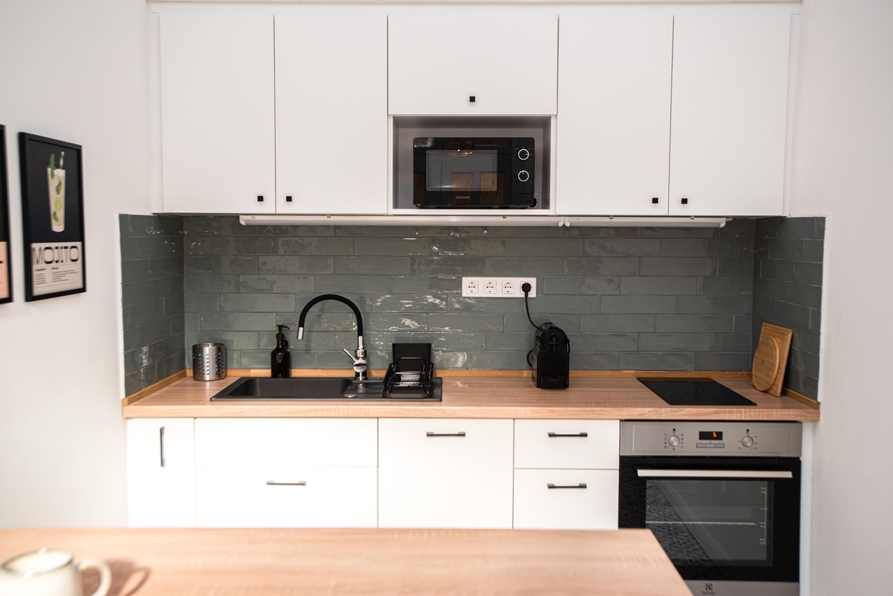 Kitchen equipment: dishwasher, induction hob, electric oven, microwave, Nespresso coffee machine, fridge-freezer.