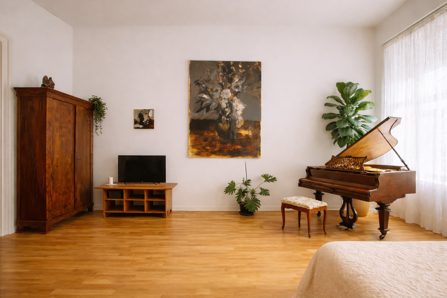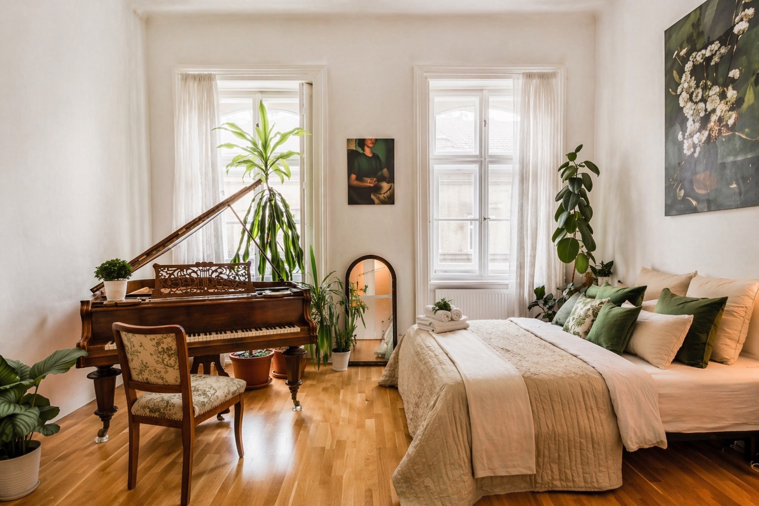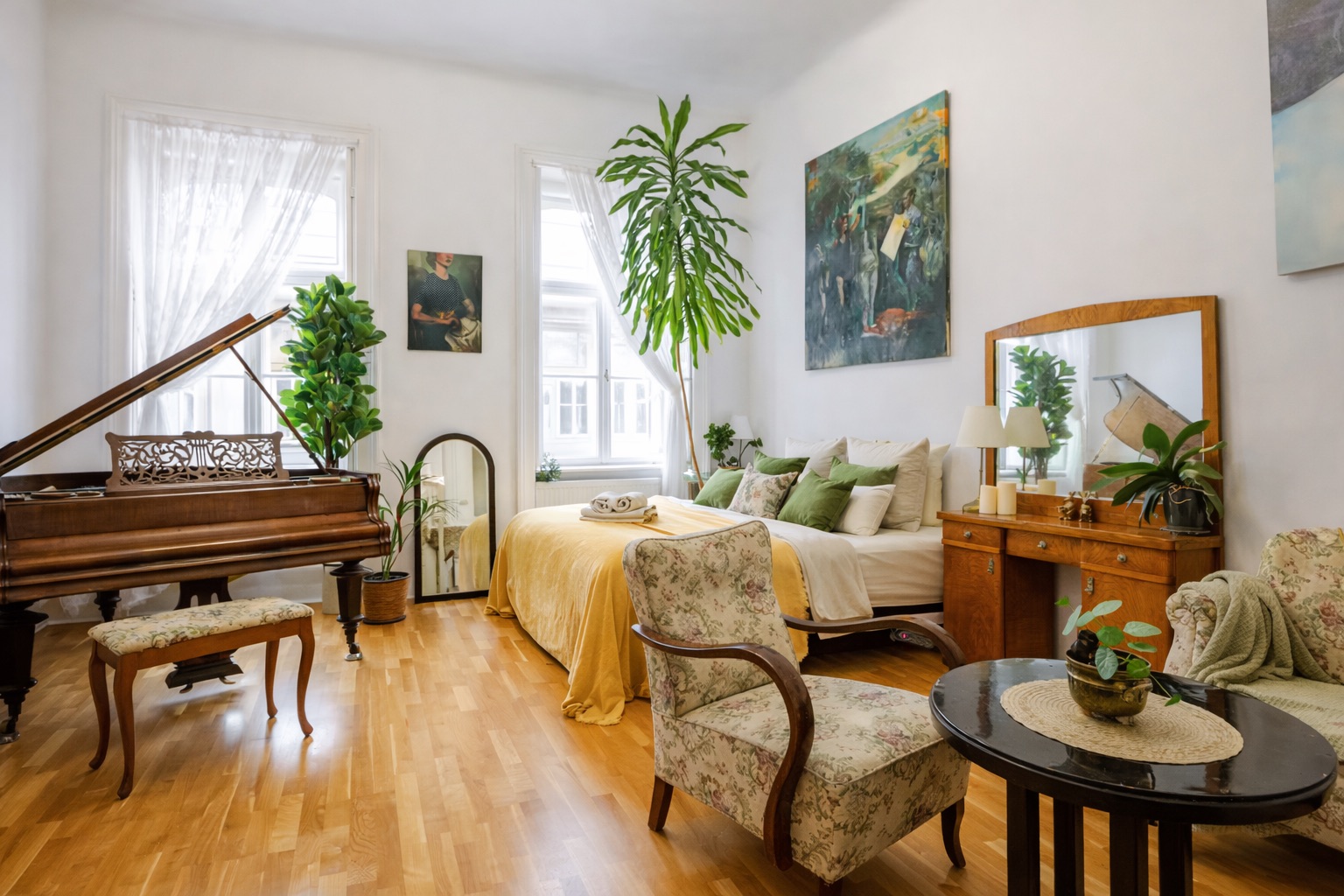 Filled with natural light, indoor plants, and a mix of original contemporary artworks. An antique functioning grand piano is also part of the living space, adding both character and a sense of history. Sometimes, you may even hear classical music drifting over from the neighbouring Liszt Museum, which gives the whole space a unique feel if you enjoy music and culture.
