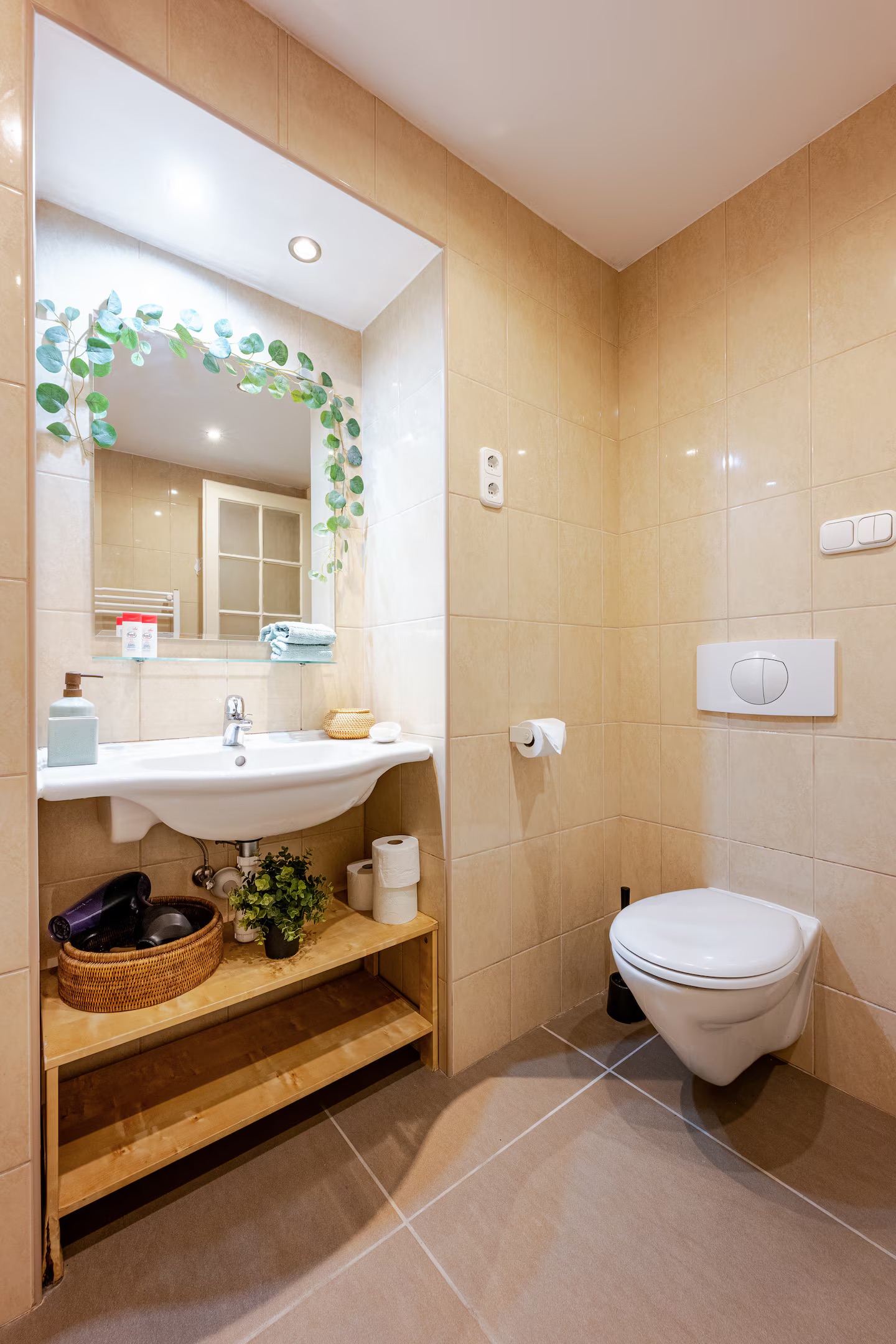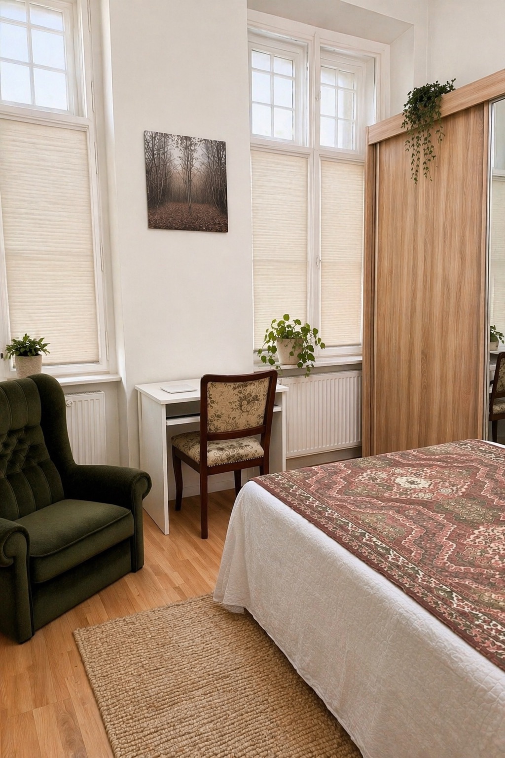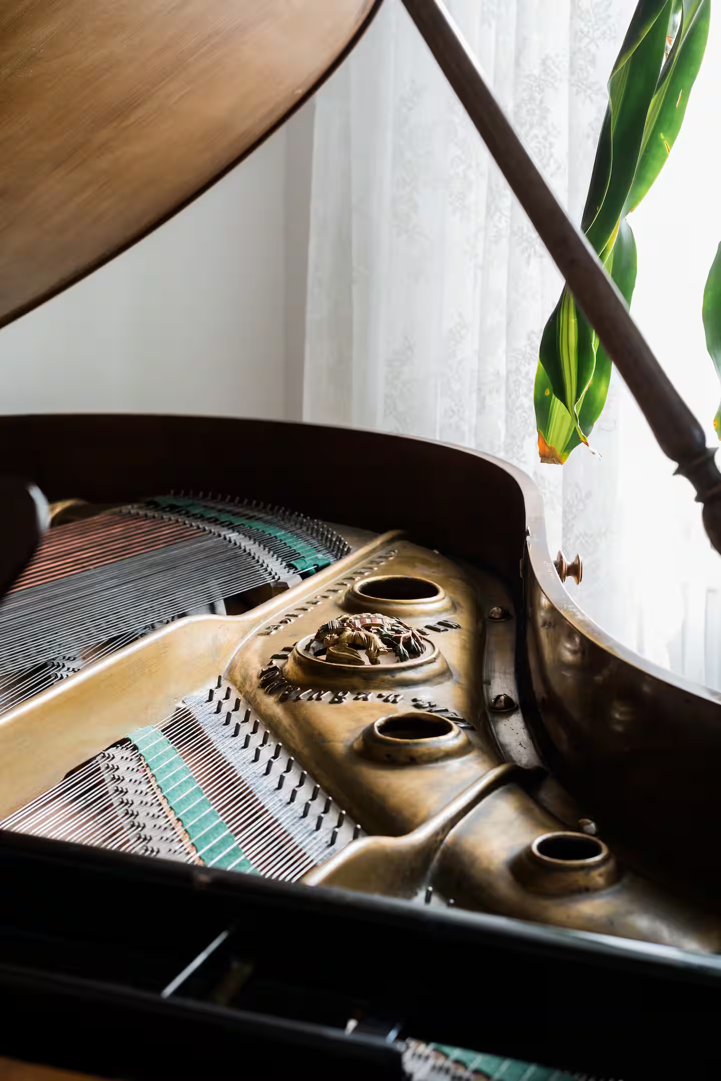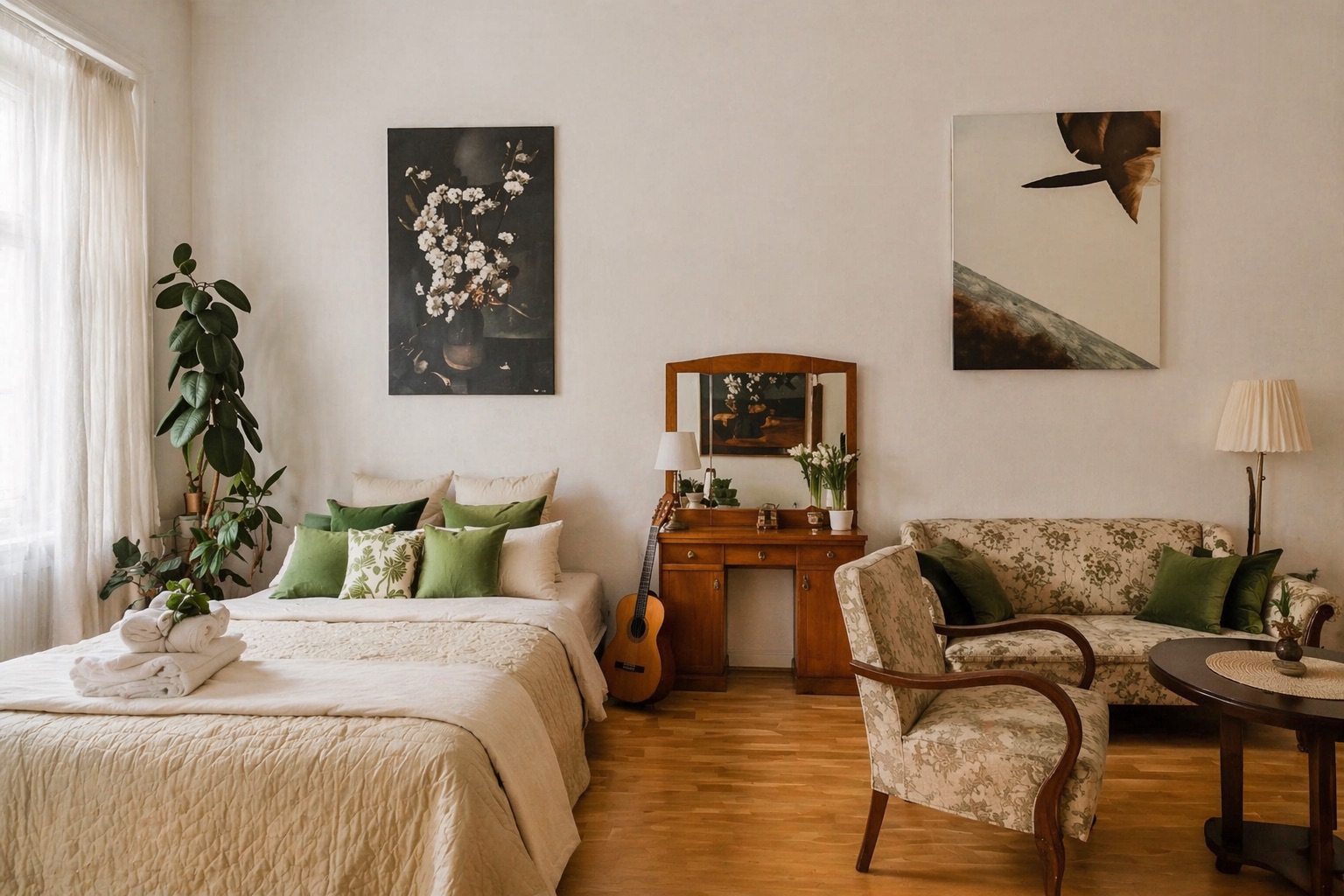 Filled with natural light, indoor plants, and a mix of original contemporary artworks. An antique functioning grand piano is also part of the living space, adding both character and a sense of history. Sometimes, you may even hear classical music drifting over from the neighbouring Liszt Museum, which gives the whole space a unique feel if you enjoy music and culture.