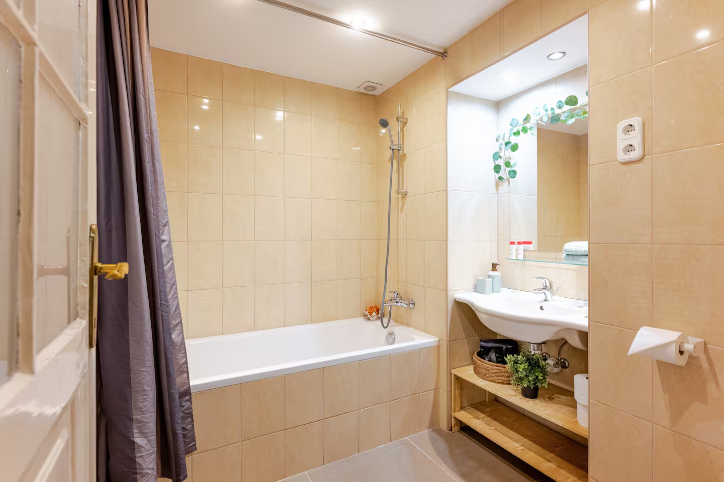 There is a spacious living room with a double bed, a separate kitchen, a bathroom with bathtub, a smaller laundry room, and an additional room that we used as a studio/guest room, which is especially practical for remote work or longer stays.